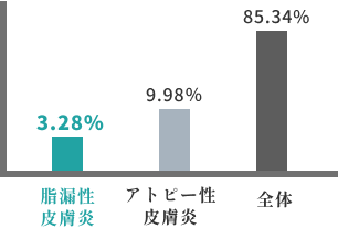 症例として名前が記載されているもので最も多いものはアトピー性皮膚炎で全体9.98%(6,731件)であり、脂漏性皮膚炎は3.28%(2,212件)と上位10番目に多い症例数となった。