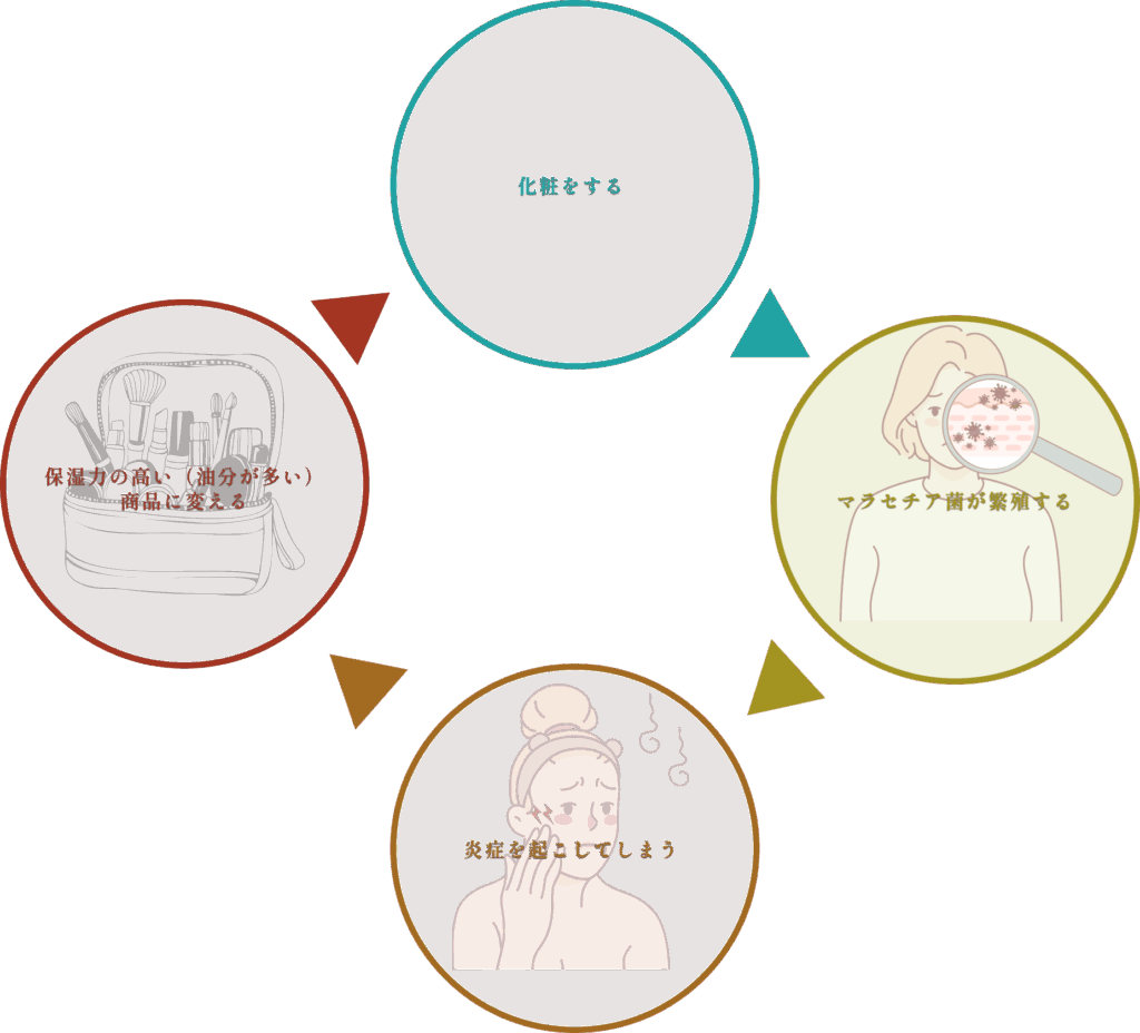 特に油分を多く含む化粧品をしている場合は、脂漏性皮膚炎の原因として考えられているマラセチア菌の異常繁殖を促してしまい、肌に炎症を要因となってしまいます。